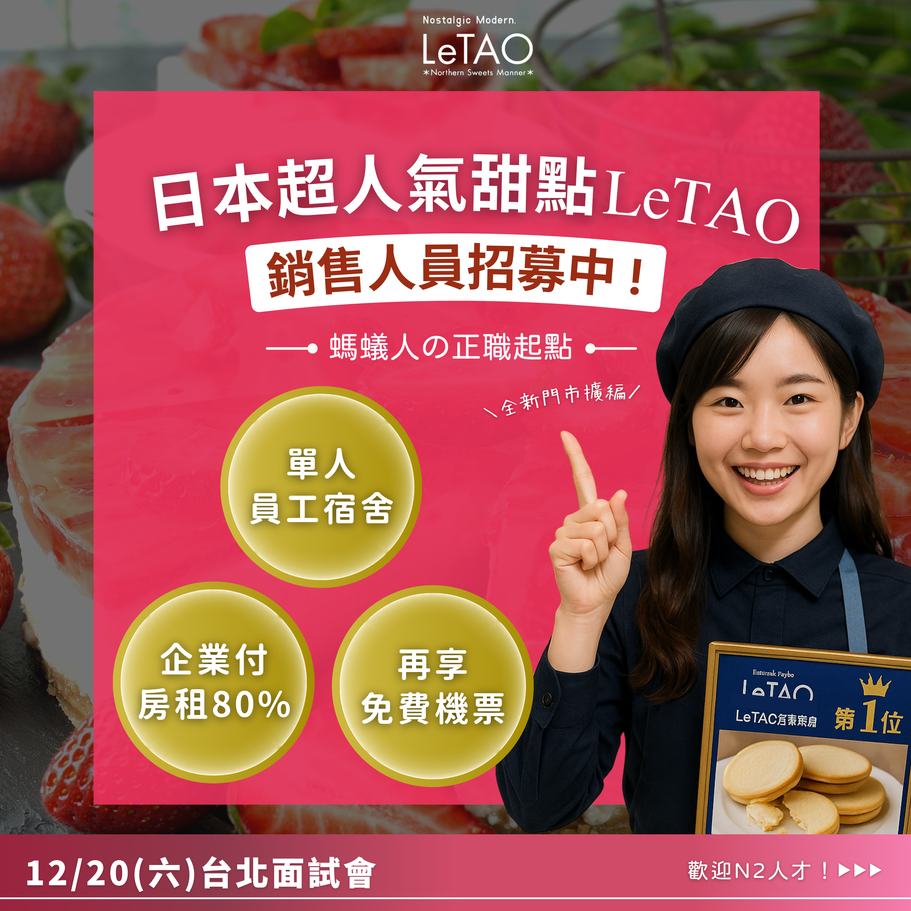 【12/20台灣邁那比赴日面試會】|單人宿舍、房租補助八成、再拿免費機票!北海道超人氣甜點 LeTAO 全新門市招募中!
