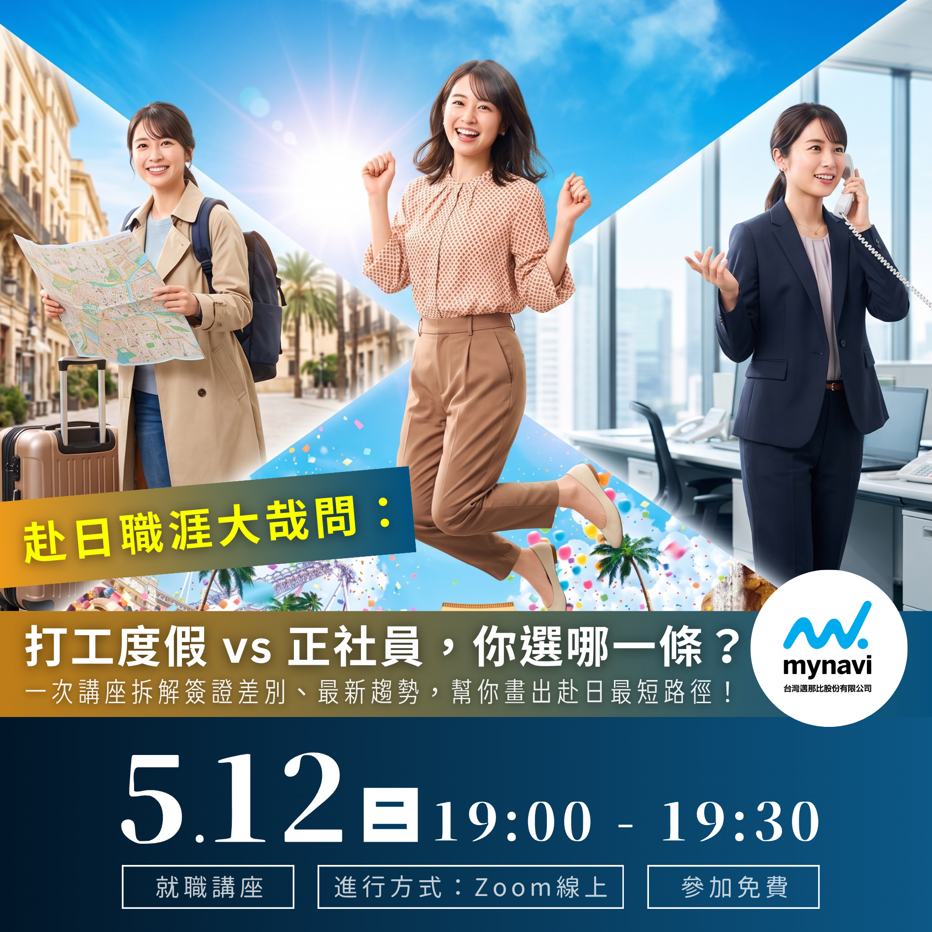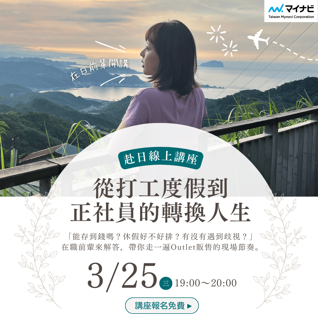 【從打工度假到正社員的轉換人生】 這次不談「想像中的日本」,將以一位前輩的親身經歷出發,帶大家了解從打工度假一路走到日本正社員的真實過程——包含工作內容與職場適應等,讓準備赴...